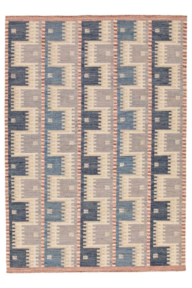 Astrid 173x233cm är en handvävd rölakan matta i 100% ull som är slitstark, praktisk men också otroligt vacker! Mattan går i blå toner men har även vita, beiga och röda inslag i mönsterfärgerna.