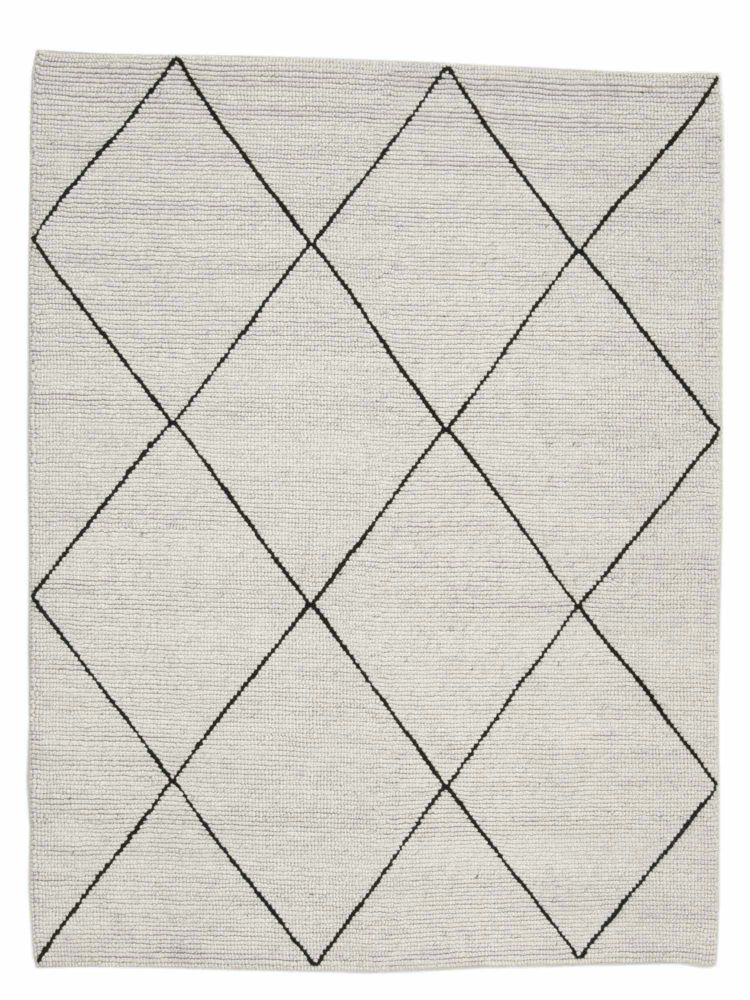 Casablanca 200x300cm, White & Black är en modern, stilren matta med ett traditionellt marockanskt, geometriskt mönster i en vit botten färg. Tack vare mixen av len bambusilke och varm ull får du en både mjuk och rejäl matta.