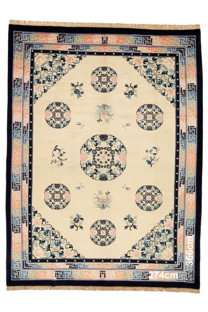 En följsam, smidig och tunnare kinamatta med antikfinish. Kinamattorna har en modern look och knyts i en harmonisk färgskala. De dekorativa inslagen i kinamattorna har nästan alltid ett symboliskt värde och de är knutna i fin, mjuk ull.