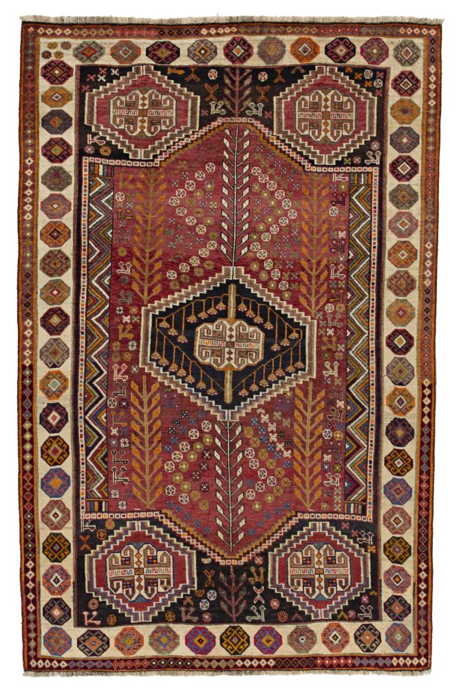 En nomadmatta knuten av kashgaifolket. De stadiga mattorna är knutna helt i ull och de talrika mönstren är deras egna, vävda ur minnet. En vanlig design är den så kallade hebatlu-designen med en central medaljong, upprepad i alla fyra hörnen. Andra har en hexagon- eller diamantformad medaljong, inuti en större medaljong, med fyra krokar.