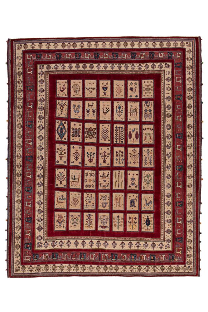 En nomadmatta knuten av kashgaifolket. De stadiga mattorna är knutna helt i ull och de talrika mönstren är deras egna, vävda ur minnet. En vanlig design är den så kallade hebatlu-designen med en central medaljong, upprepad i alla fyra hörnen. Andra har en hexagon- eller diamantformad medaljong, inuti en större medaljong, med fyra krokar.