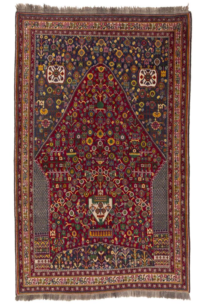 En nomadmatta knuten av kashgaifolket. De stadiga mattorna är knutna helt i ull och de talrika mönstren är deras egna, vävda ur minnet. En vanlig design är den så kallade hebatlu-designen med en central medaljong, upprepad i alla fyra hörnen. Andra har en hexagon- eller diamantformad medaljong, inuti en större medaljong, med fyra krokar.