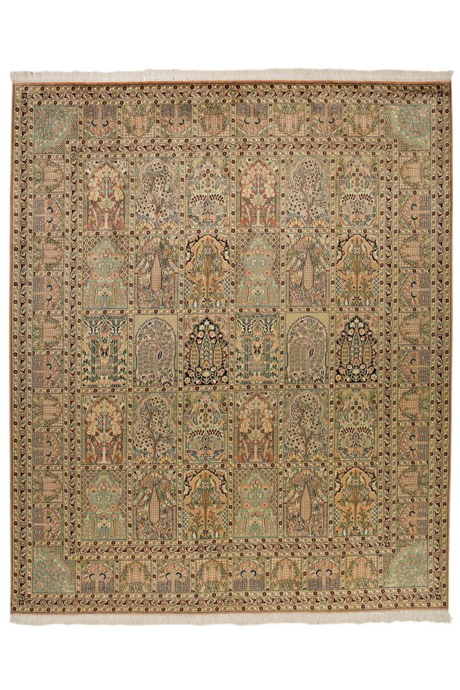 Kashmir är en paradisiskt vacker plats på jorden med prunkande trädgårdar, fantastisk blomsterprakt och sjöar med världsunika flytande trädgårdar. Lika vackra är dessa mattor som återspeglar naturens skönhet och anses vara en av de starkast gnistrande juvelerna bland Orientens finaste mattor. Den här Kashmirmattan är knuten i härligt glansig och mjuk konstsilke.