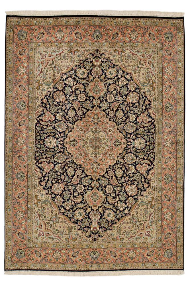 Denna exklusiva matta tillverkas enligt gamla traditioner i Srinagar, huvudstaden i Kashmir. Kashmir är en paradisiskt vacker plats på jorden med prunkande trädgårdar, fantastisk blomsterprakt och sjöar med världsunika flytande trädgårdar. Lika vackra är silkesmattorna från Kashmir som återspeglar naturens skönhet och anses vara en av de starkast gnistrande juvelerna bland Orientens finaste mattor.