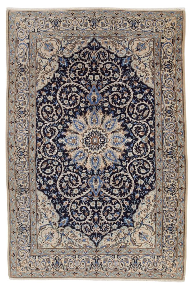 Exklusiva, ljusa och eleganta... Nainmattorna är utsökt fina, tunna och tätknutna mattor av högsta kvalitet. De lite mer exklusiva Nainmattorna är knutna i ull på silkesvarp eller till och med helt i silke. Nainmattorna är ljusa, i svala blåa toner med mycket vitt. Design och storlekar varierar, men ett slingrande blomstermönster är typiskt. Nain Tabas är en matta i lite grövre ull som är en utmärkt, slitstark bruksmatta.