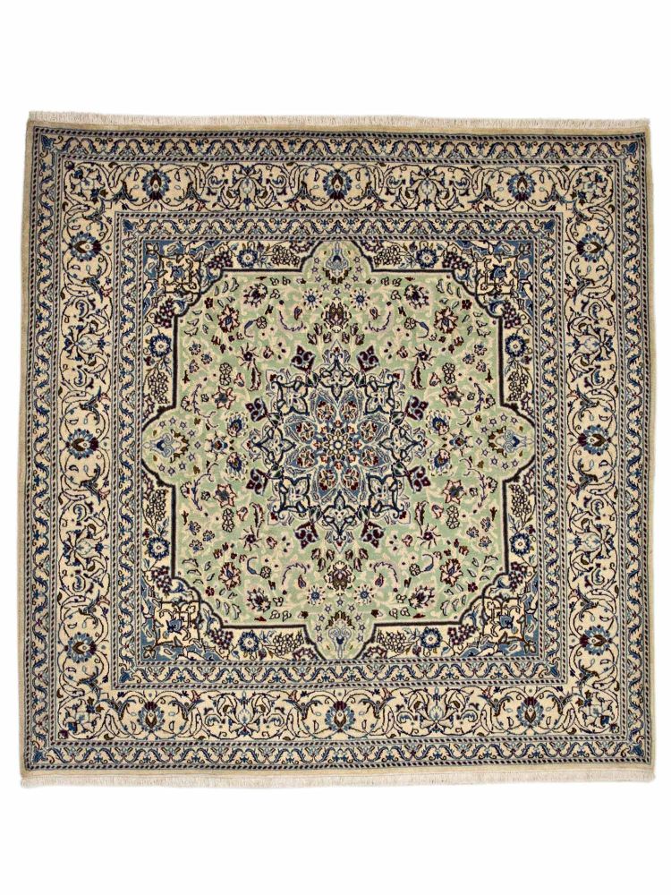 Exklusiva, ljusa och eleganta... Nainmattorna är utsökt fina, tunna och tätknutna mattor av högsta kvalitet. De lite mer exklusiva Nainmattorna är knutna i ull på silkesvarp eller till och med helt i silke. Nainmattorna är ljusa, i svala blåa toner med mycket vitt. Design och storlekar varierar, men ett slingrande blomstermönster är typiskt. Nain Tabas är en matta i lite grövre ull som är en utmärkt, slitstark bruksmatta.