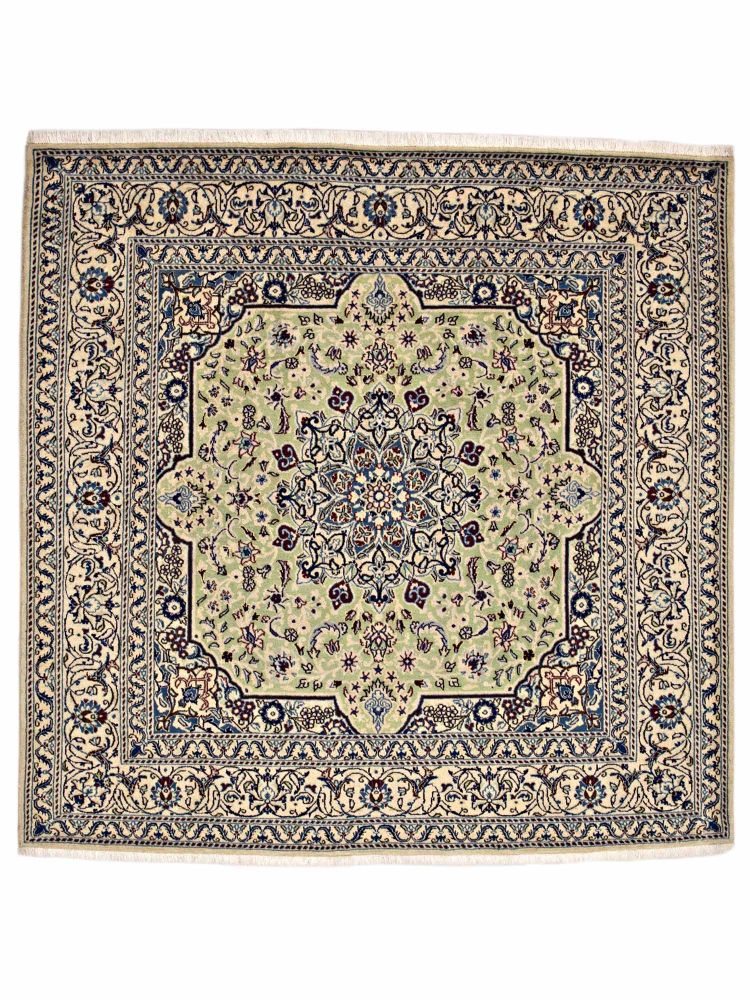 Exklusiva, ljusa och eleganta... Nainmattorna är utsökt fina, tunna och tätknutna mattor av högsta kvalitet. De lite mer exklusiva Nainmattorna är knutna i ull på silkesvarp eller till och med helt i silke. Nainmattorna är ljusa, i svala blåa toner med mycket vitt. Design och storlekar varierar, men ett slingrande blomstermönster är typiskt. Nain Tabas är en matta i lite grövre ull som är en utmärkt, slitstark bruksmatta.