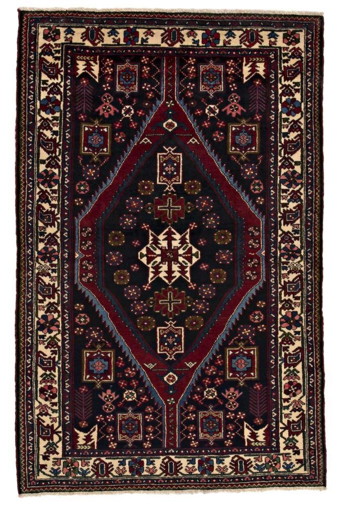 En nomadmatta från västra Iran med geometriska mönster där mörkrött och mörkblått dominerar.